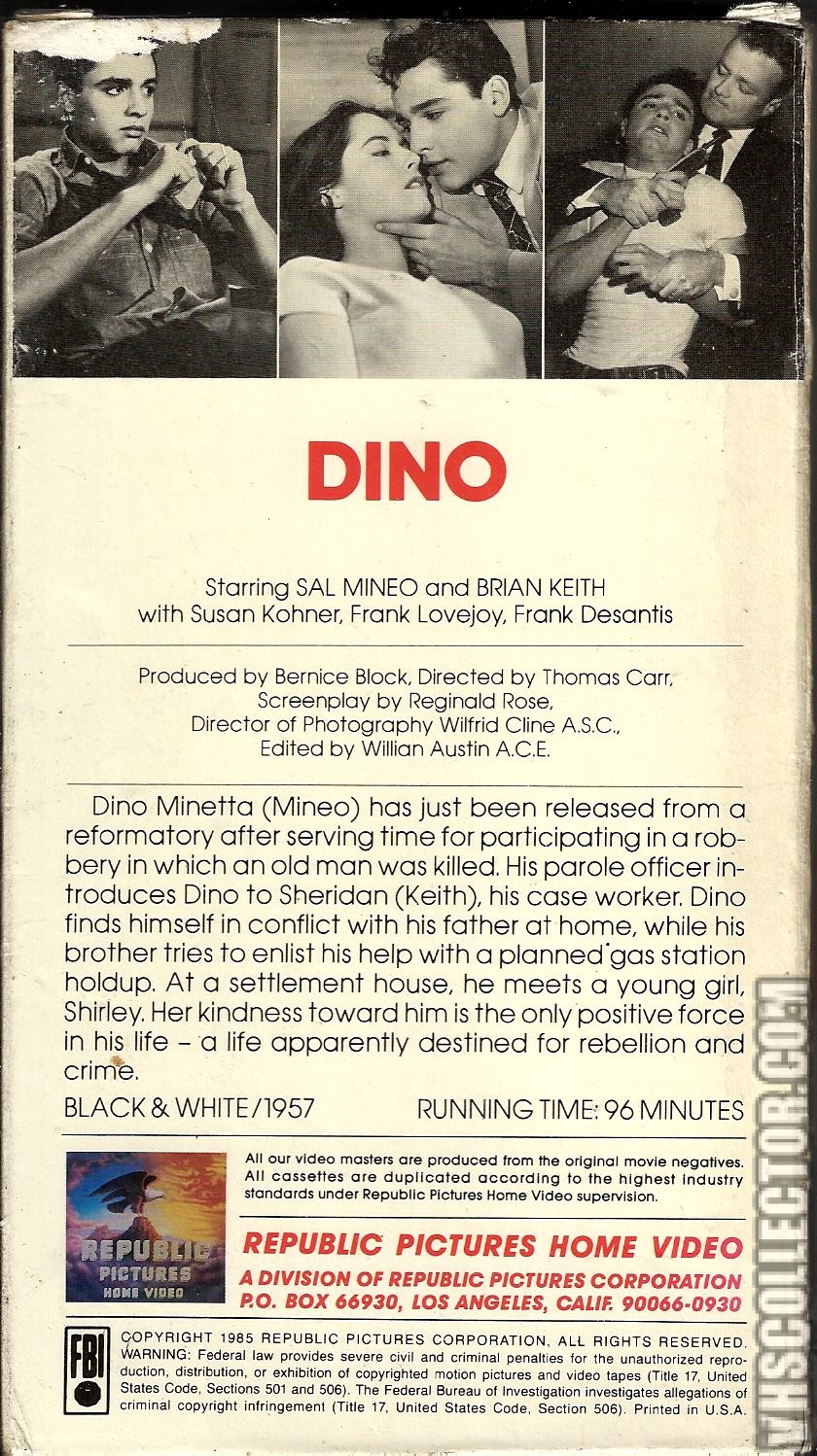 Adapted from his own TV play by Reginald Rose, Dino stars Sal Mineo (who also appeared in the TV version) in the title role. Sent to reform school for his complicity in a gang killing, Dino is released in the custody of kindly settlement worker Sheridan (Brian Keith). Despite the efforts by Sheridan and parole officer Mandel (Frank Faylen) to set the boy on the right path, sullen Dino intends to rejoin his old gang at the first opportunity. Only when he realizes that his younger brother Tony (Pat DeSimone) is in danger of becoming an irredeemable juvenile delinquent does Dino gets wise to himself. It also helps when he falls in love with Shirley (Susan Kohner), a "plain-Jane" girl he meets at Sheridan's settlement house. Rarely seen today, Dino is one of the better "j.d." films of its era.