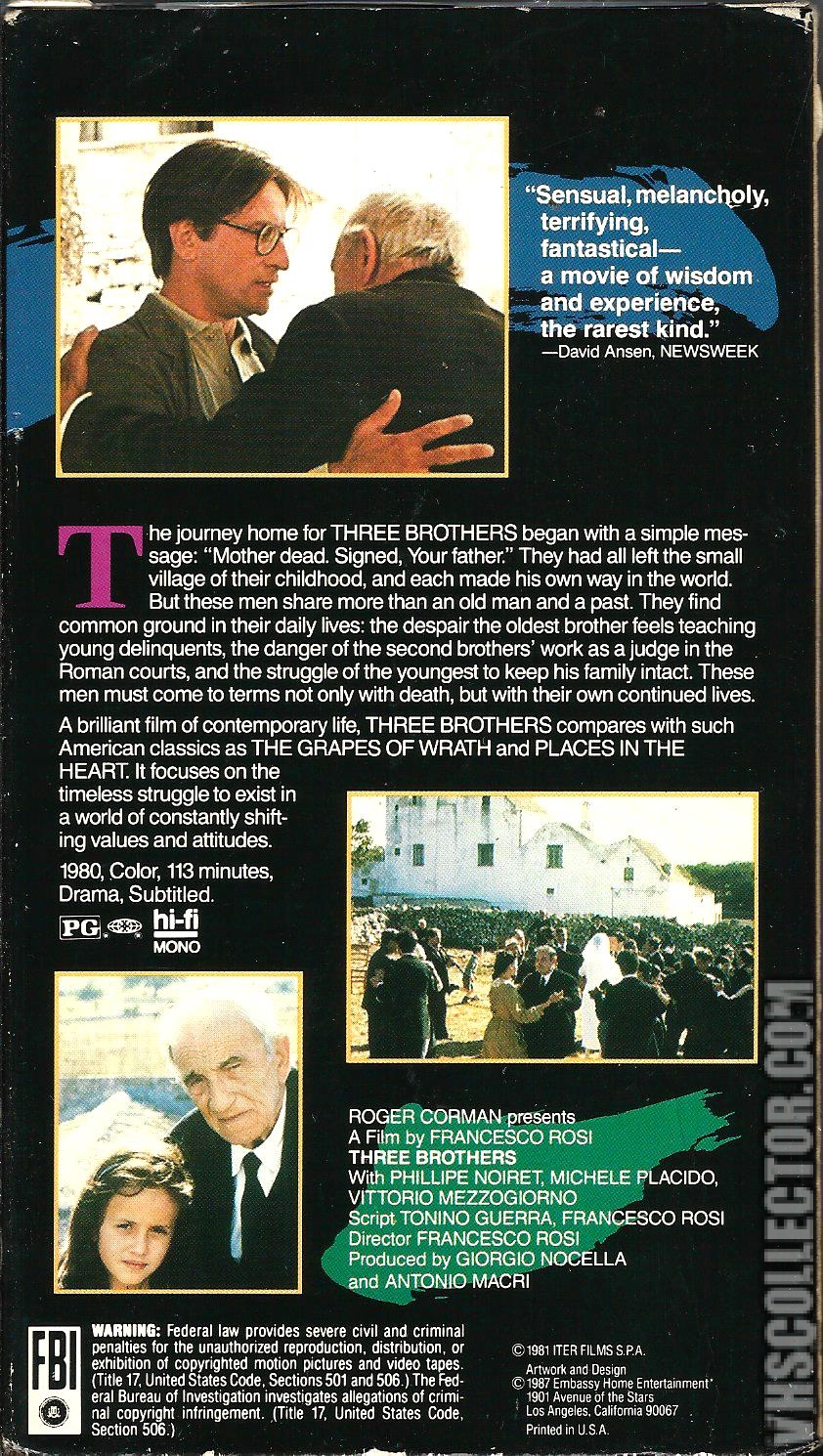 Three Brothers (Italian: Tre fratelli) is a 1981 Italian film based on a work by Andrei Platonov. It was directed by Francesco Rosi and stars Philippe Noiret, Vittorio Mezzogiorno, Michele Placido and Charles Vanel.